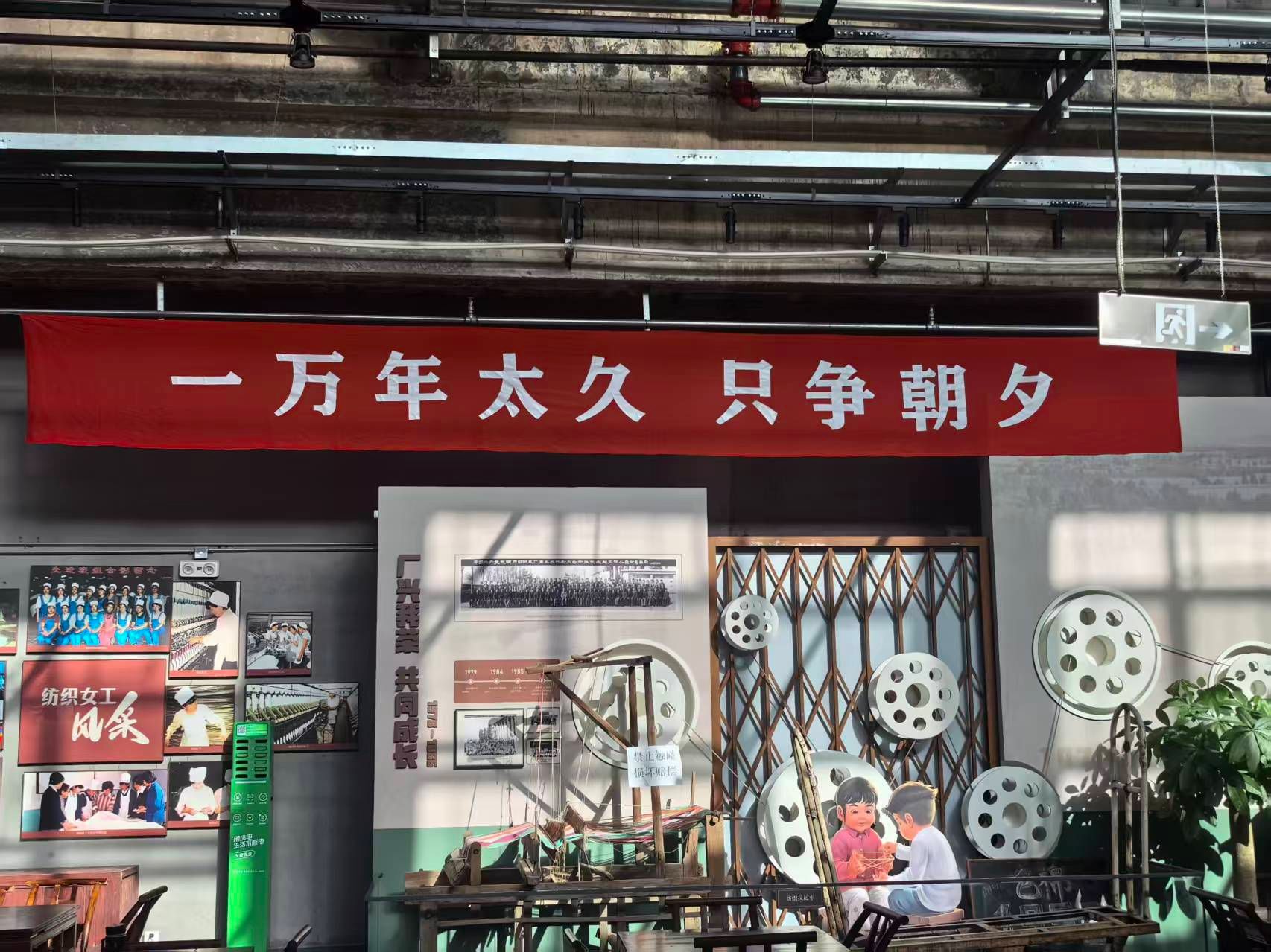 第二站支部来到“包棉1958主题街区”,在这里探寻红色印记,汲取奋进力量。斑驳的厂房、陈旧的纺织设备、珍贵的老照片,支部党员被这里深深吸引着,彼此谈论着,似乎自己置身于那个全民奋进年代,身临其境于包头棉纺厂从1958年建厂之初的艰苦创业,到发展成为亚洲最大棉纺织厂的辉煌历程。墙壁上的“一千年太久,只争朝夕”更是对青年学生的精神鼓舞与行为鞭策,包棉人融入DNA的艰苦奋斗、勇于创新的精神深深打动着每一位学生党员。这是一种勉励,一个方向,青年学子定当以知识为帆,创新为桨,在科学研究的征程上奋楫远航。