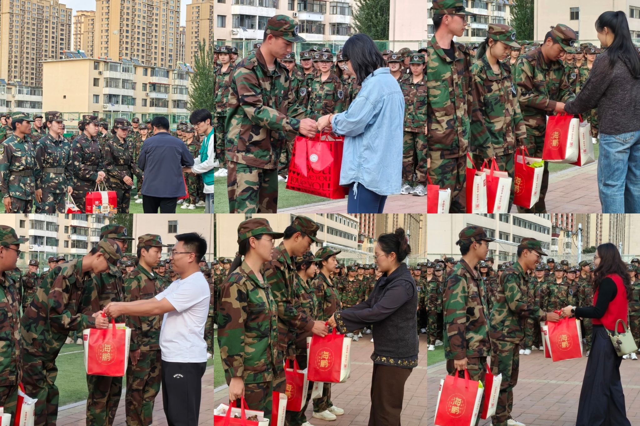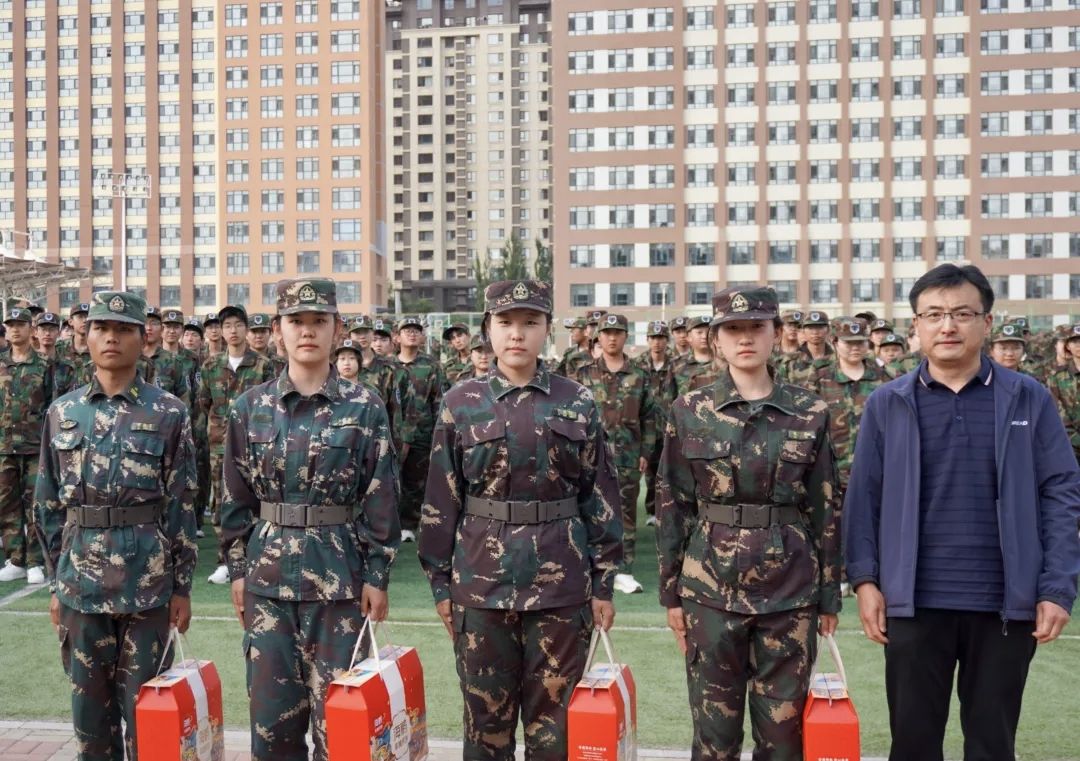 随后,王晓东副书记带领学工办老师乌日根老师、张超老师,贾镇宁老师、陈明真老师以及班主任代表王佩君老师,军训教导员冯宁宁老师一同来到军训队伍中,向辛勤付出的教官们表达了诚挚的感谢,并赠送了精心准备的月饼礼盒。这份礼物不仅寄托了学院对教官们的认可与期望,更传递了学院对新生们的深切关怀。教官们接过礼盒,脸上洋溢着欣慰的笑容,训练场上充满了温情与敬意。同学们也深受鼓舞,他们以更加挺拔的军姿和整齐划一的动作回应着学院的关爱。